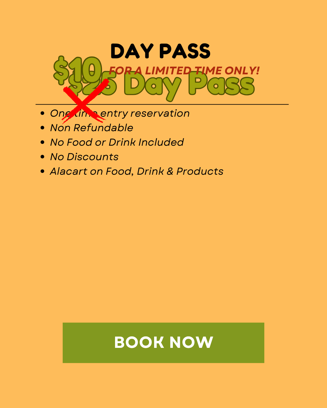 The fee for the Day Pass is $25 per person. (For a Limited time $10). You can book the Day Pass online at the reservation checkout.